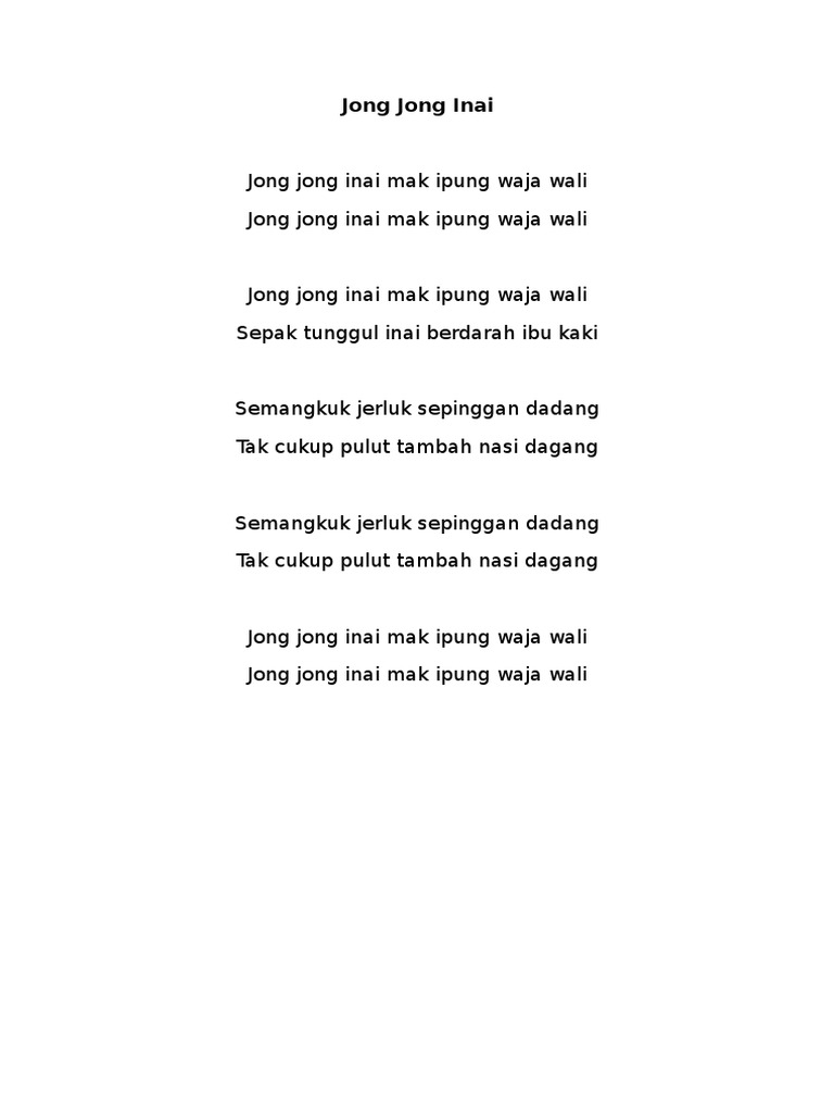 Jong Jong Inai Lirik / Jong Jong Inai Lirik Lagu Muzik / Savesave kalau rasa gembira dan jong jong inai sepak tunggul inai berdarah ibu kaki ( 2x ) semangkuk jerluk sepinggan dagang tak cukup pulut tambah nasi dagang ( 2x ) jong jong inai mak ipong raja.
