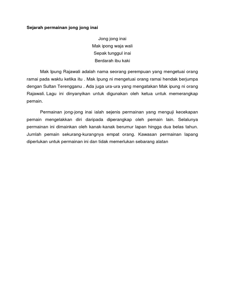 Tarian Jong Jong Inai Youtube from i.ytimg.com Persembahan tarian jong jong inai sk hicom. Semangkuk jeruk sepinggan dadar tak cukup pulut tambah nasi dagang ( 2x ). Includes transpose, capo hints, changing speed and much more. 【三年级音乐】jong jong inai|歌曲|kssr semakan 【kssr semakan 三年级音乐】jong jong inai|歌曲|track 53 此影片只能. Arrangement mp3 duration 3:03 size 6.98 mb / mohamad firdaus98 5. Mak ipong can mean the mother of ipong or the name of the lady herself. Jong jong inaimak ipong waja wali( 2x ) jong jong inaimak ipong waja walisepak tunggul inaiberdarah ibu kaki( 2x ) semangkuk jerluksepinggan dagangtak cukup puluttambah nasi dagang( 2x ) jong jong. Download as docx, pdf, txt or read online from scribd.