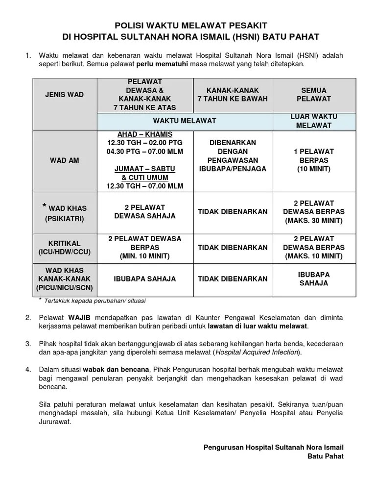 Hospital selayang visiting hours / waktu melawat:* 12.30pm to 2pm, 5pm to 7pm daily (*subject to some rules for child visitors and icu wards, please call hospital to confirm).